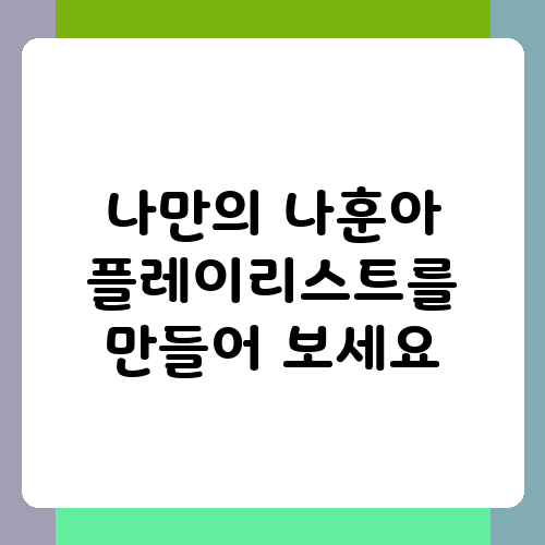이제 여러분이 좋아하는 나훈아 노래들을 모아 나만의 플레이리스트를 만들어보세요. 신나는 곡들을 모아 힘찬 하루를 시작할 수도 있고, 감성적인 곡들로 하루의 피로를 풀 수도 있습니다. 혹은, 시대별 히트곡을 모아 나훈아의 음악적 변천사를 느껴보는 것도 색다른 재미를 줄 거예요. 여러분만의 특별한 플레이리스트를 만들어 언제 어디서든 나훈아의 노래를 즐겨보시길 바랍니다. 저도 벌써부터 여러분의 플레이리스트가 어떻게 구성될지 궁금해지네요! 지금 바로 나만의 나훈아 음악 여행을 시작해보세요.