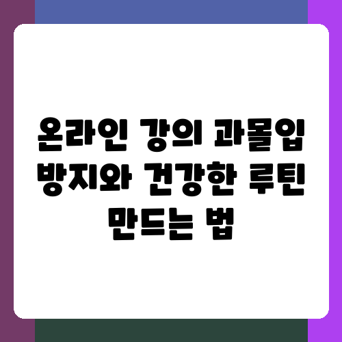 온라인 강의는 편리하지만, 과몰입은 오히려 학습 효율을 떨어뜨리고 건강을 해칠 수 있습니다. 시간표를 계획하고, 규칙적인 휴식 시간을 갖고, 쾌적한 학습 환경을 조성하고, 구체적인 학습 목표를 세우고, 강의 후에는 자신을 위한 시간을 가지는 것. 이 모든 노력들이 건강하고 효율적인 온라인 학습을 위한 필수 요소들입니다. 지금부터 바로 시작해보세요! 여러분의 성공적인 온라인 학습을 응원합니다!