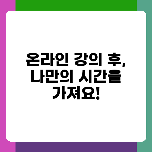 온라인 강의를 마치고 나면, 자신을 위한 시간을 꼭 가지는 것이 중요합니다. 강의 내용을 복습하거나 과제를 하는 것도 좋지만, 자신이 좋아하는 취미 활동을 하거나 친구들과 시간을 보내는 등 스트레스를 해소하고 균형 잡힌 삶을 유지하는 것이 필요합니다. 저녁에는 좋아하는 책을 읽거나 영화를 보며 휴식을 취하고, 주말에는 친구들을 만나거나 여행을 가는 등 다양한 활동을 통해 재충전하는 시간을 가지도록 노력하고 있습니다. 이러한 시간은 다음 학습에 대한 동기 부여를 높이고 학습 효율을 향상시키는 데 도움이 됩니다.