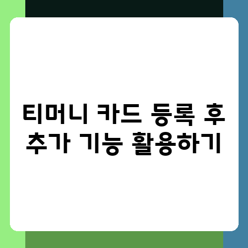 티머니 카드 등록 후에는 다양한 추가 기능을 활용할 수 있습니다. 티머니 앱에서는 카드 충전, 이용 내역 확인, 교통카드 분실 신고 등 다양한 기능을 편리하게 이용할 수 있습니다. 뿐만 아니라, 최근에는 티머니 카드를 간편 결제 수단으로 활용하는 곳도 많아지고 있습니다. 오프라인 매장에서도 티머니 카드를 사용하여 결제할 수 있는 곳이 늘어나고 있다는 점을 참고하세요. 저는 개인적으로 티머니 앱의 이용 내역 확인 기능이 정말 편리하더라고요. 언제 어디서 얼마나 사용했는지 한눈에 확인할 수 있어서 좋습니다. 자주 사용하는 기능을 즐겨찾기에 추가해두면 더욱 편리하게 사용할 수 있으니, 꼭 활용해 보세요.